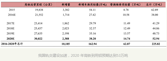 高鐵:中國軌道鋁合金車輛的批量生產始于2001年,目前90%的高鐵車輛都采用了鋁合金車體,鋁合金車體重量在8.5-10噸/輛,其中90%以上為鋁型材,其余為鋁板材,此外車輛內飾每輛車大約用1000公斤鋁合金材料。